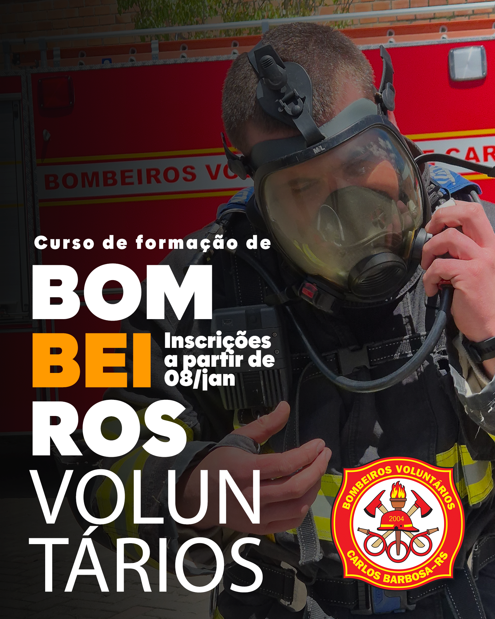 Curso de Formação de Bombeiros Voluntários – Inscrições Abertas ✔️ Inscrições: 08/01 a 14/02/2026✔️ Online: www.cbvcarlosbarbosa.com.br/painel✔️ Local do curso: Sede dos...